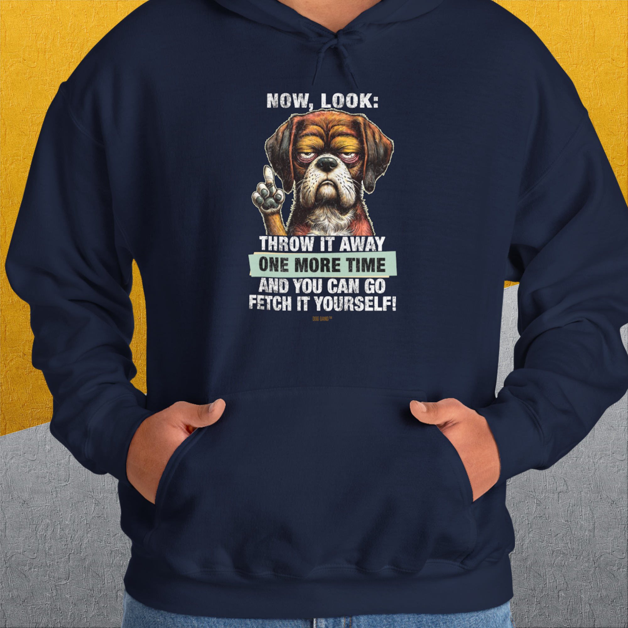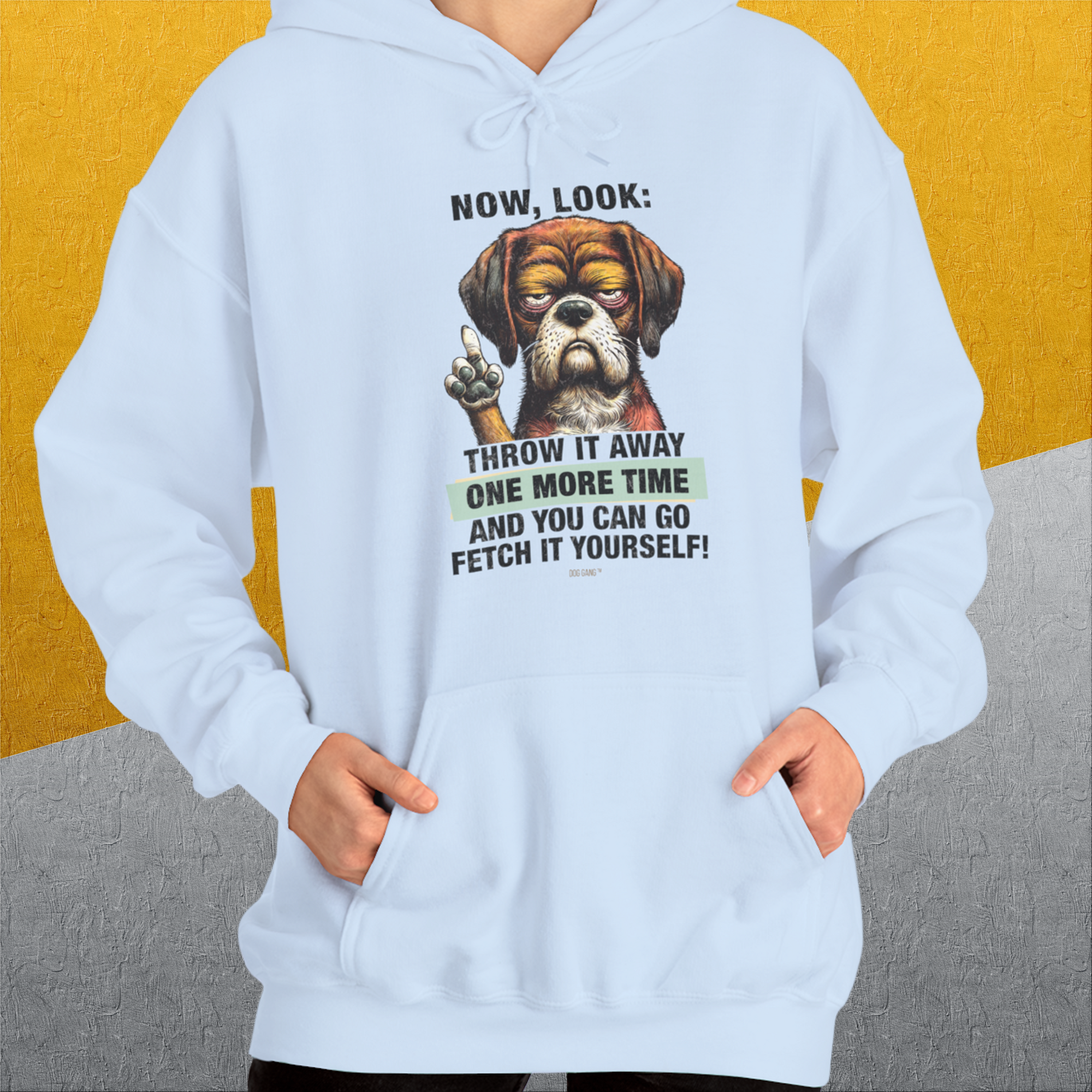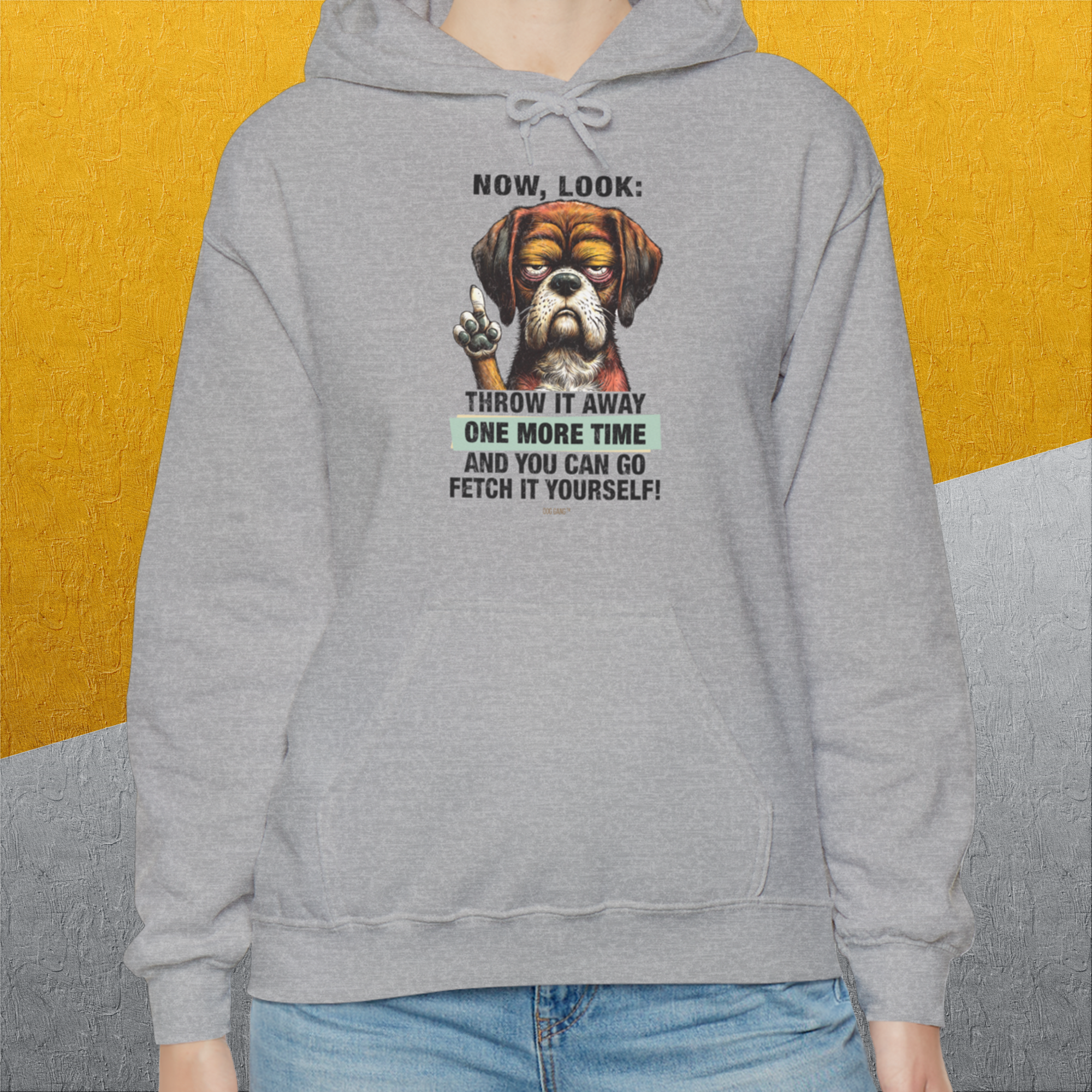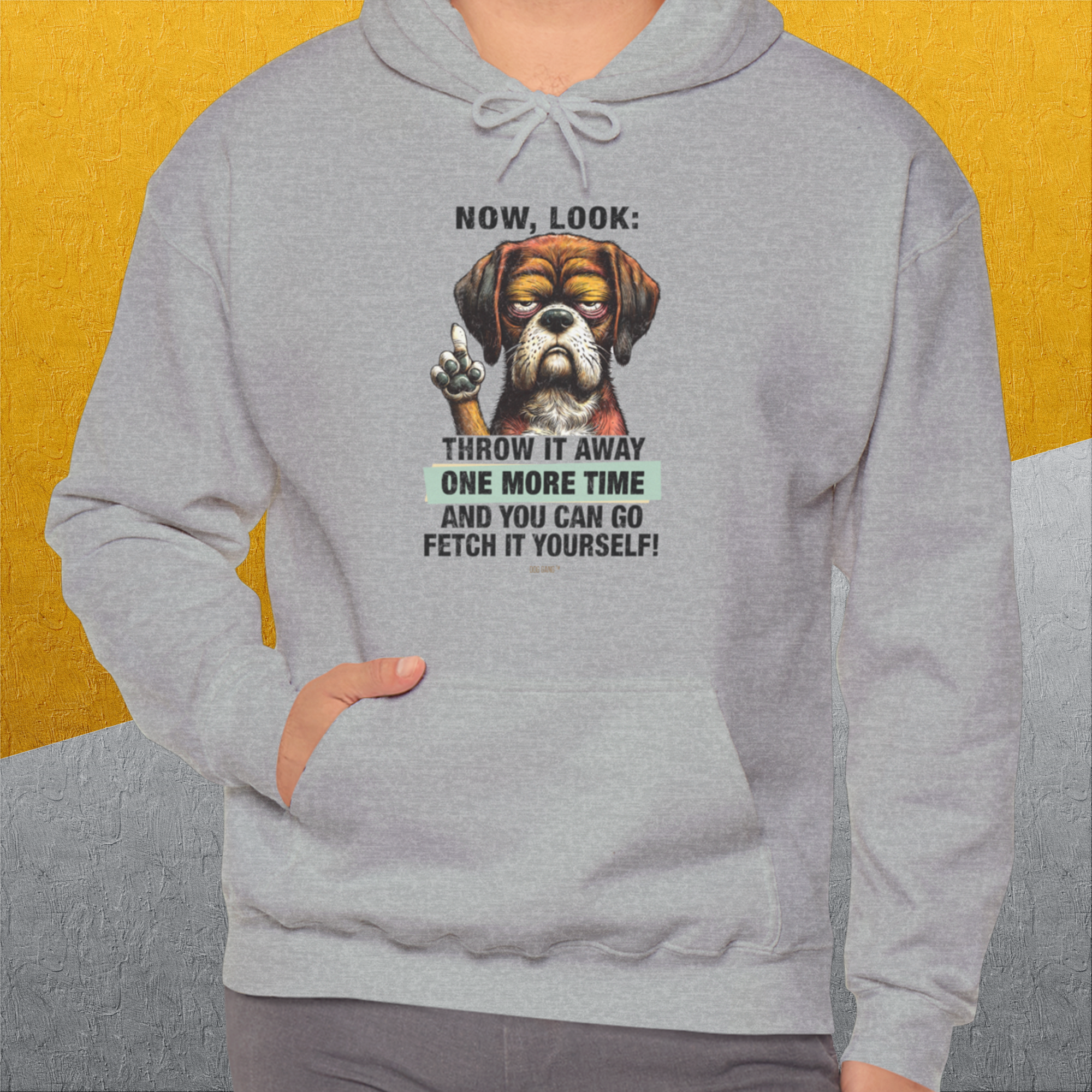 The Go Fetch It Yourself Series, Volume 2 Unisex Hoodie in Sport Grey features a funny dog design with the quote: Throw it away one more time and you can go fetch it yourself! Designed by Dog Gang.