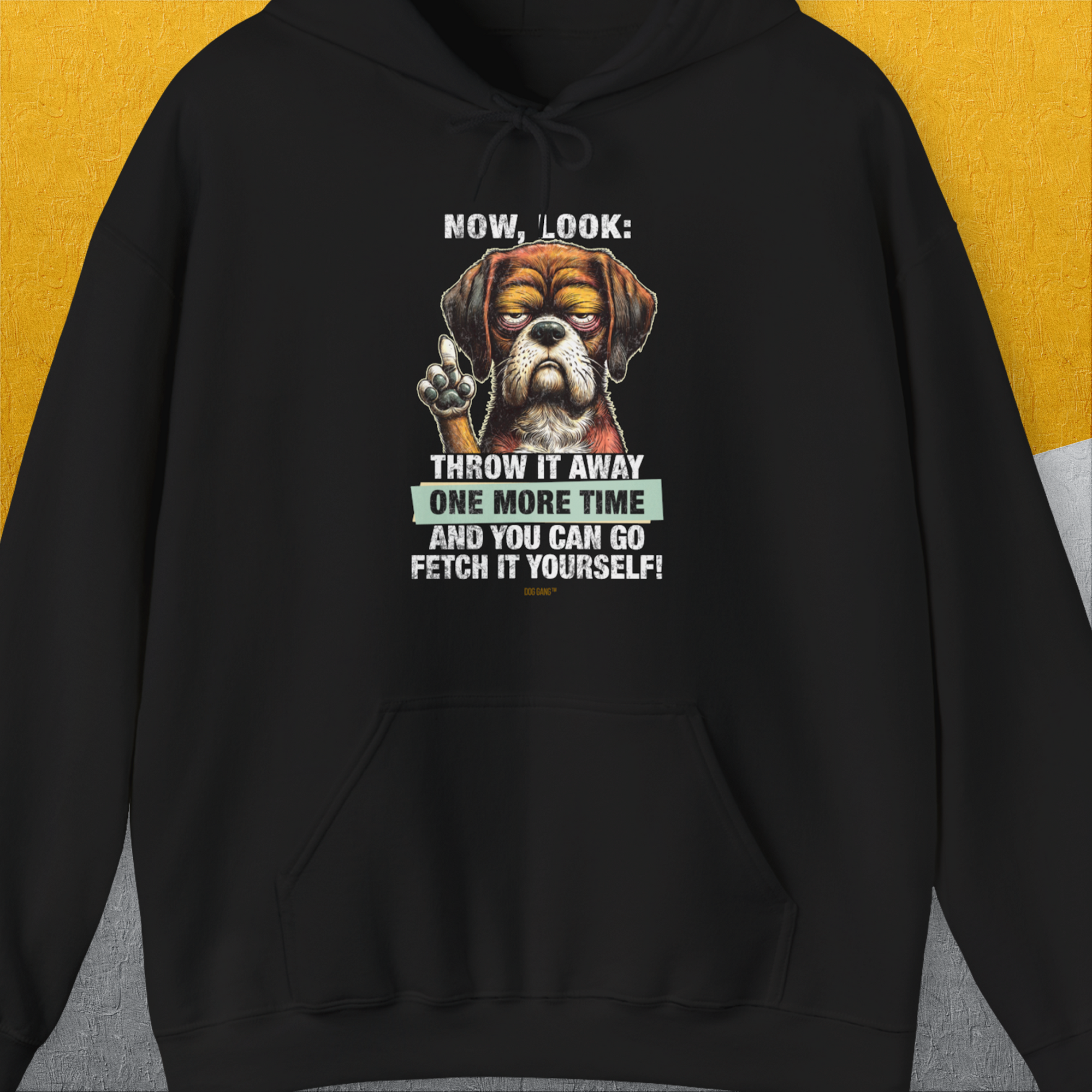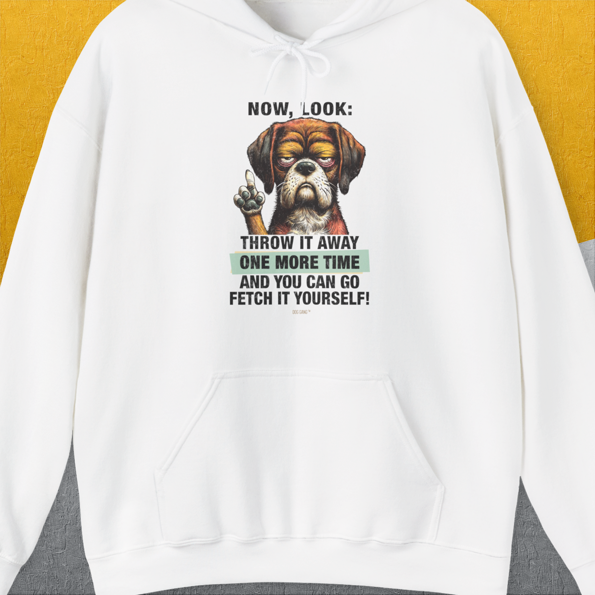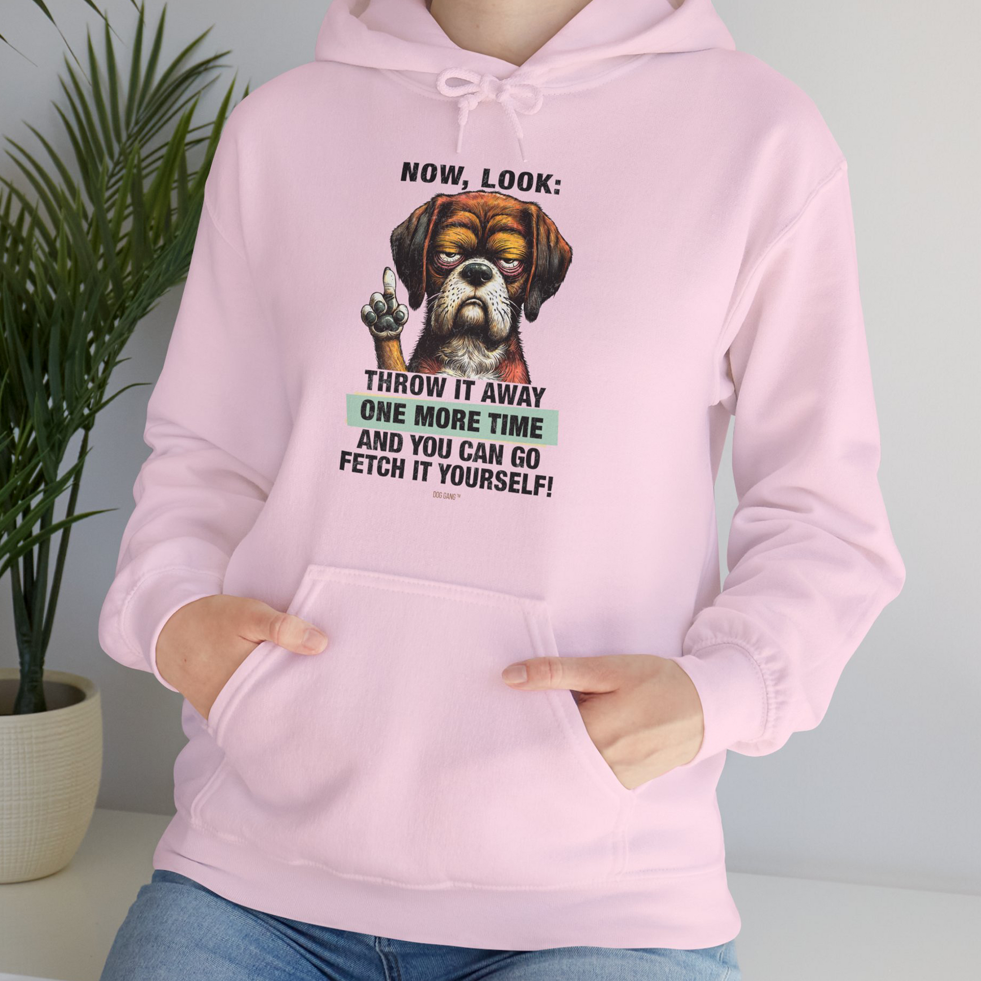 The Go Fetch It Yourself Series, Volume 2 Unisex Hoodie in Sport Grey features a funny dog design with the quote: Throw it away one more time and you can go fetch it yourself! Designed by Dog Gang.