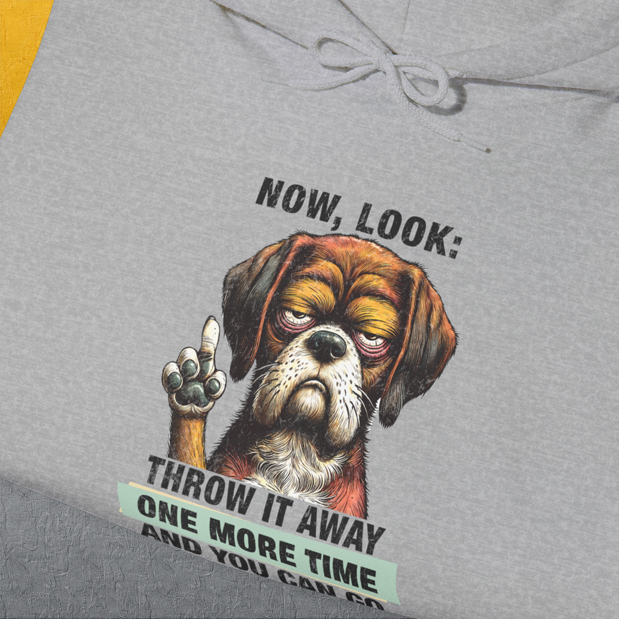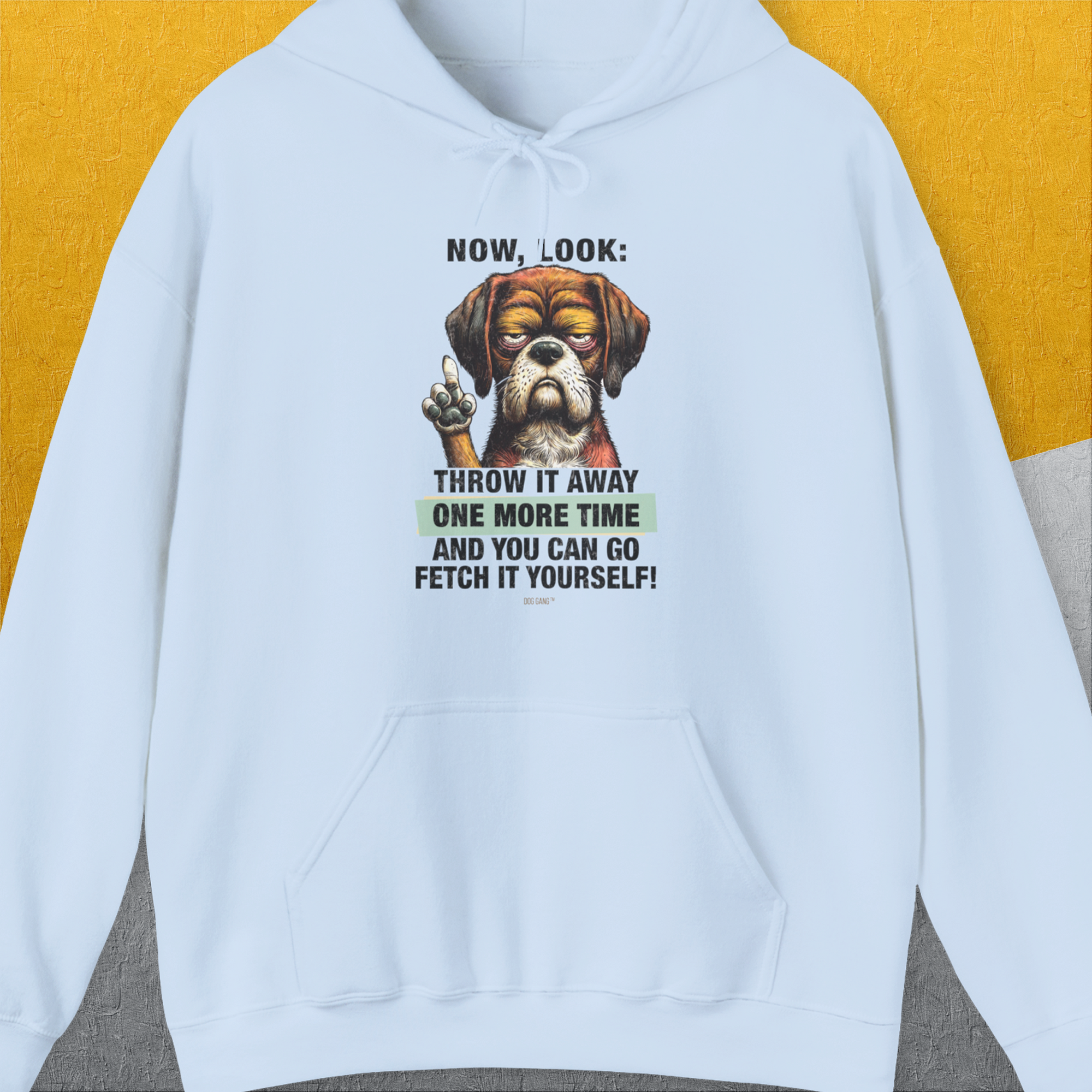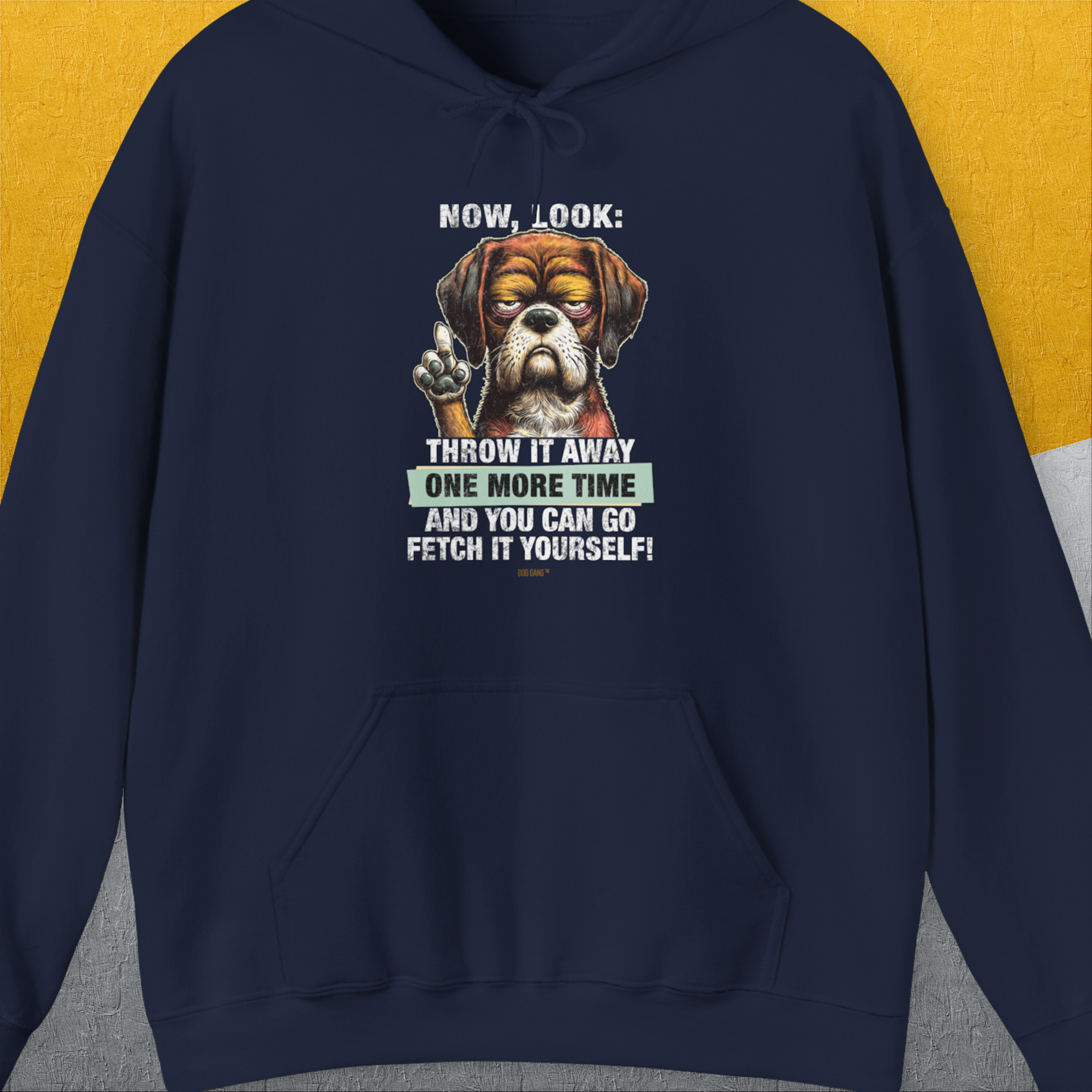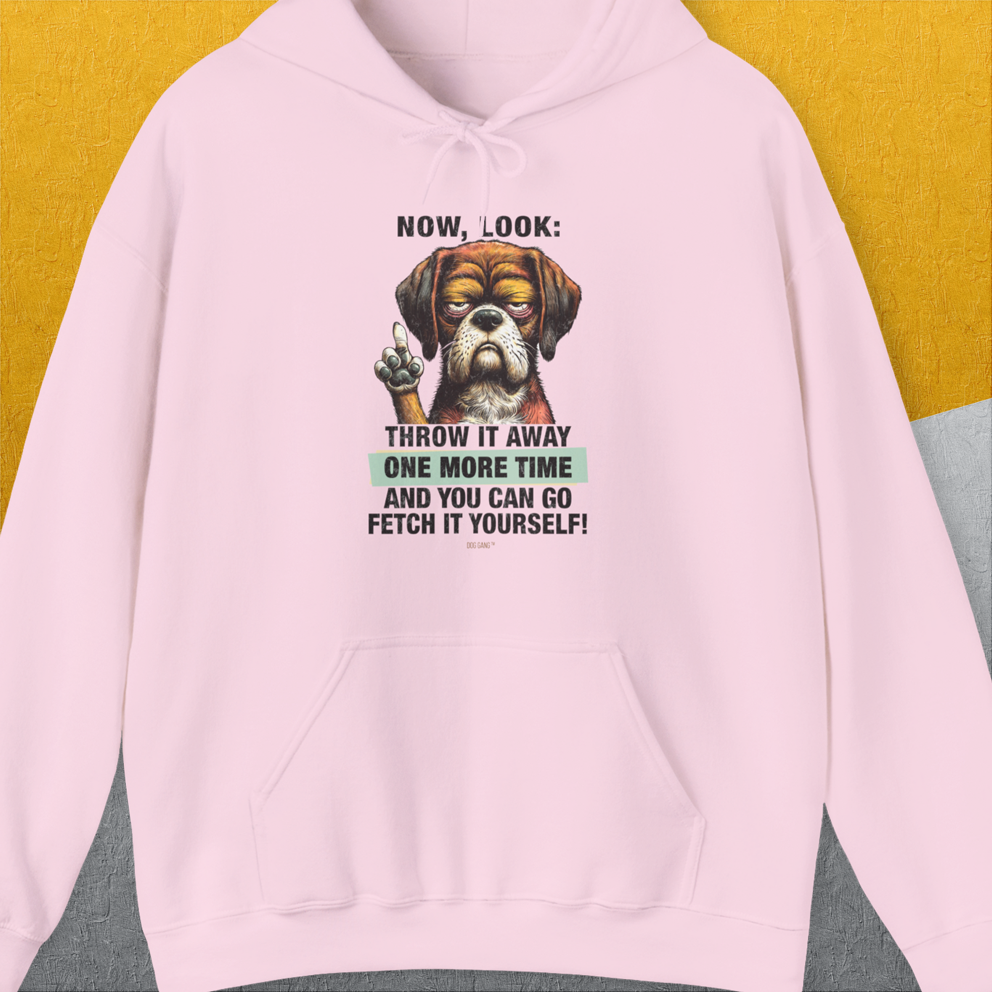 The Go Fetch It Yourself Series, Volume 2 Unisex Hoodie in Sport Grey features a funny dog design with the quote: Throw it away one more time and you can go fetch it yourself! Designed by Dog Gang.