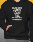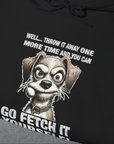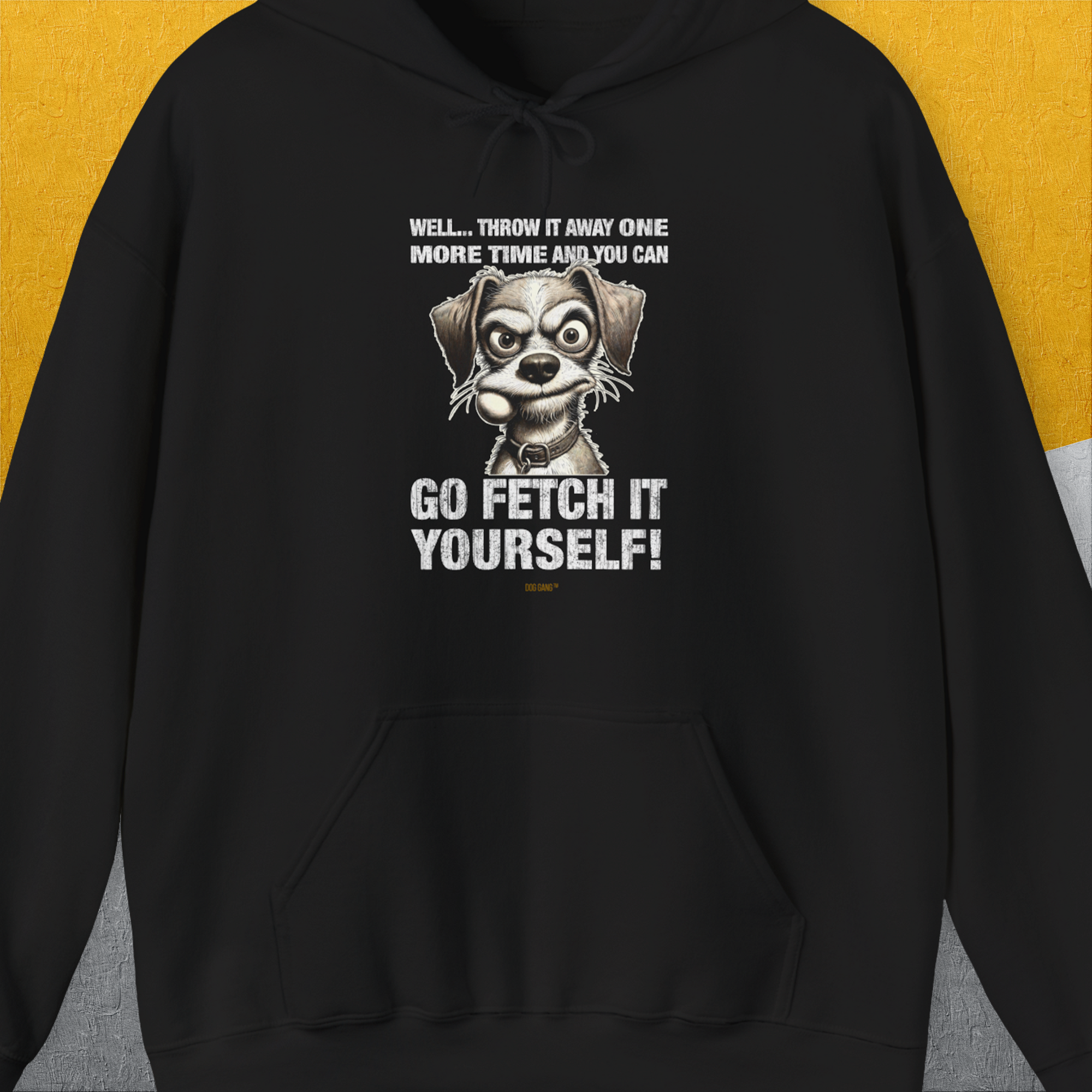 The Go Fetch It Yourself Series, Volume 4, Unisex Hoodie in black boasts a cute dog design with a playful saying: Well... throw it away one more time and you can Go fetch it yourself! Designed by Dog Gang.