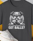 The Got Balls? Volume 4 Unisex T-Shirt features a bulldog graphic with the playful text Got Balls?. A funny dog shirt for any casual outing. Designed by Dog Gang.