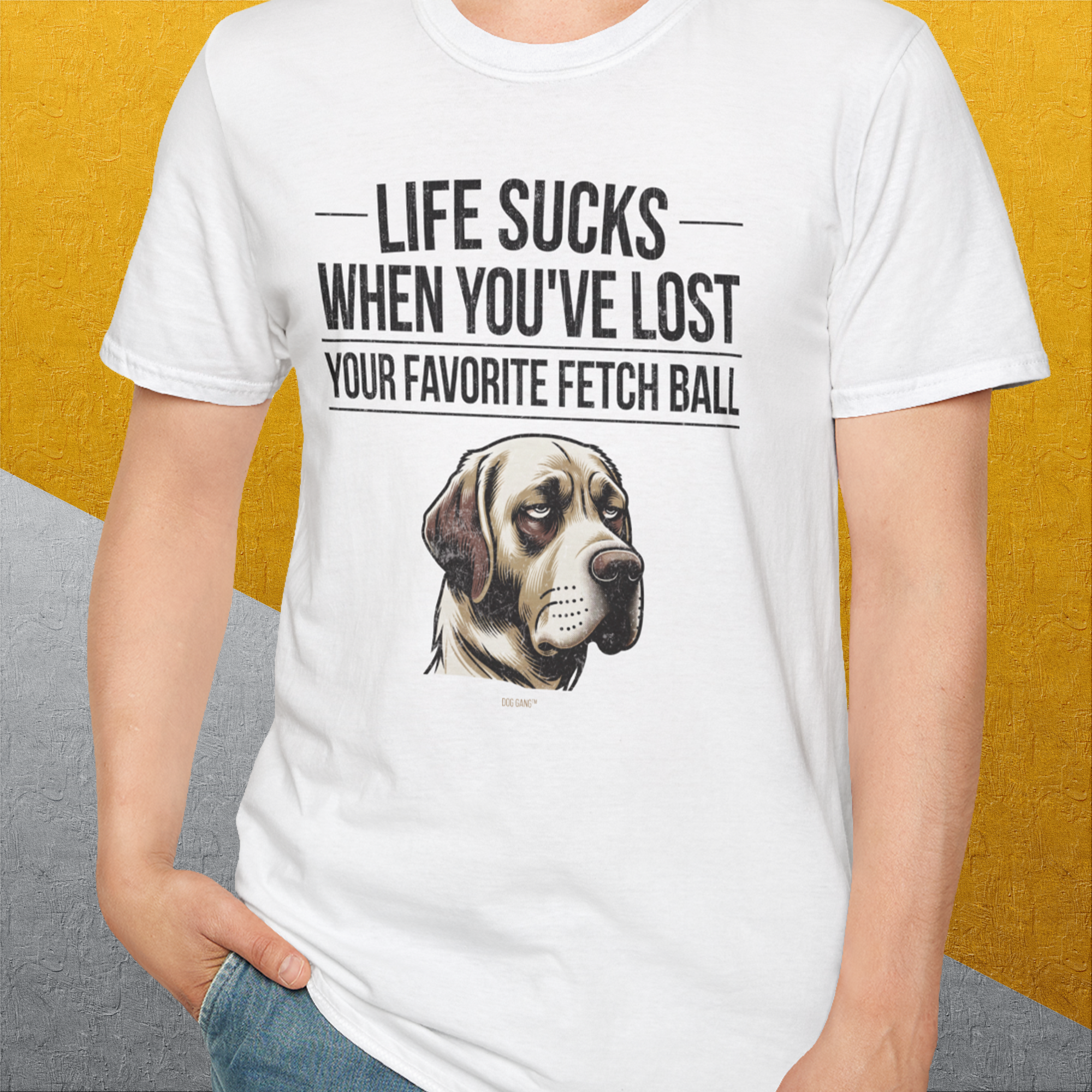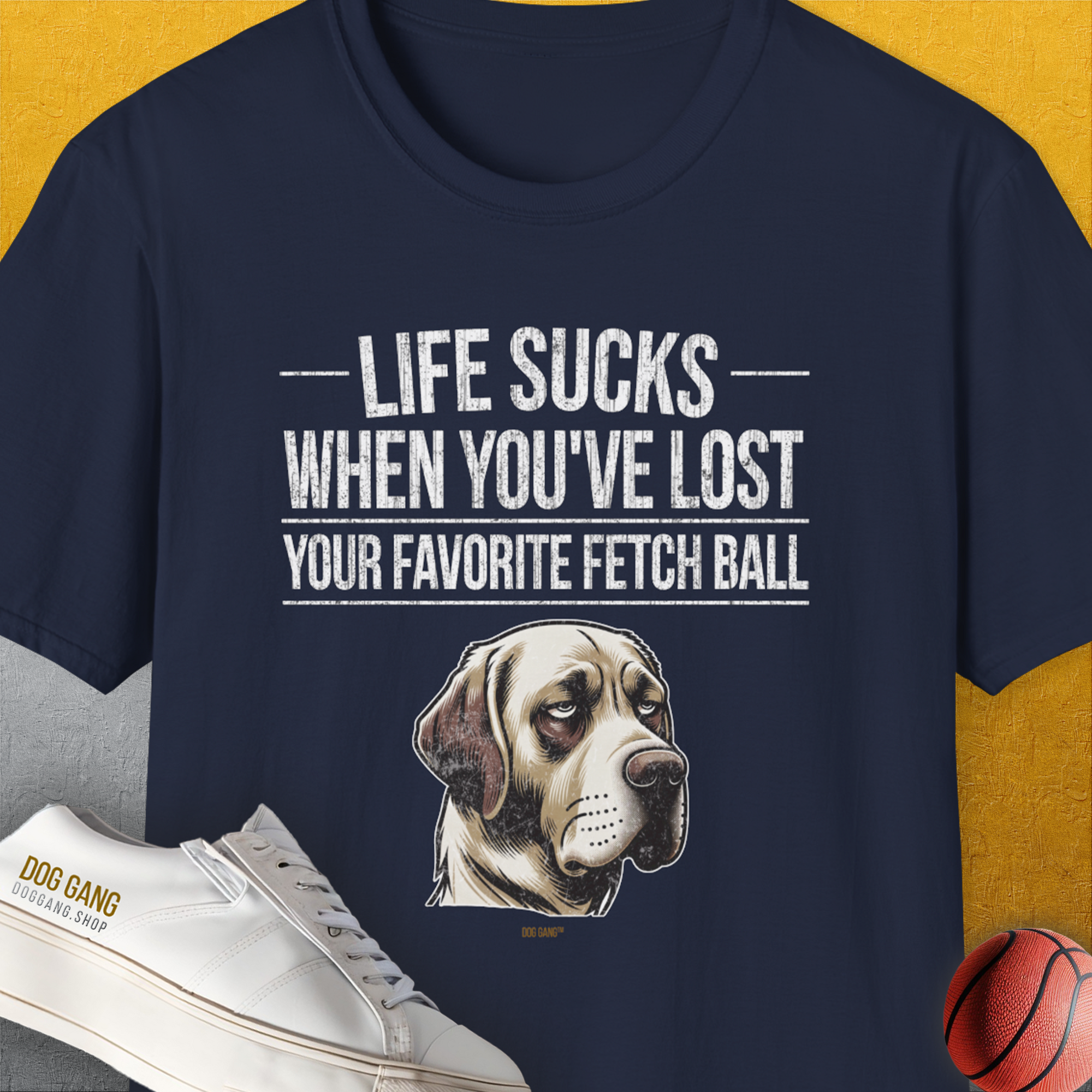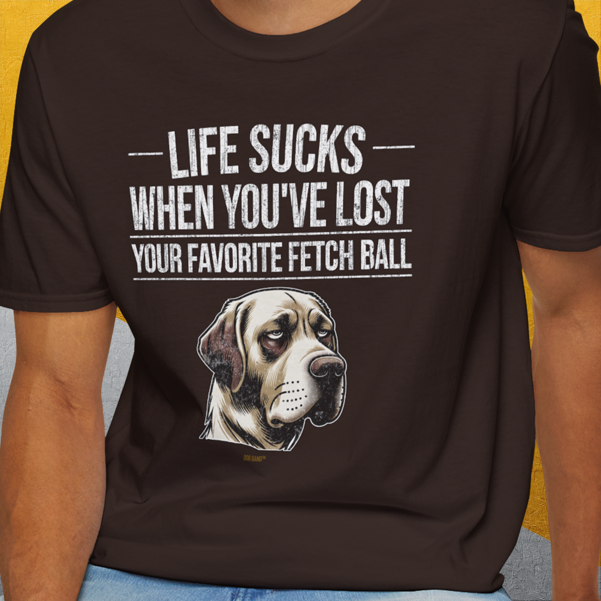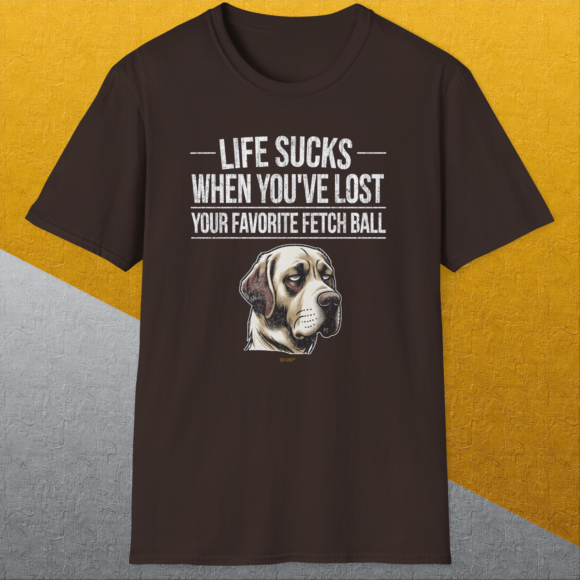 Soft-style cotton blend unisex t-shirt with a sad dog illustration and the quote: Life Sucks When Youve Lost Your Favorite Fetch Ball. Designed by Dog Gang.