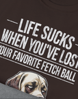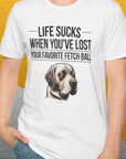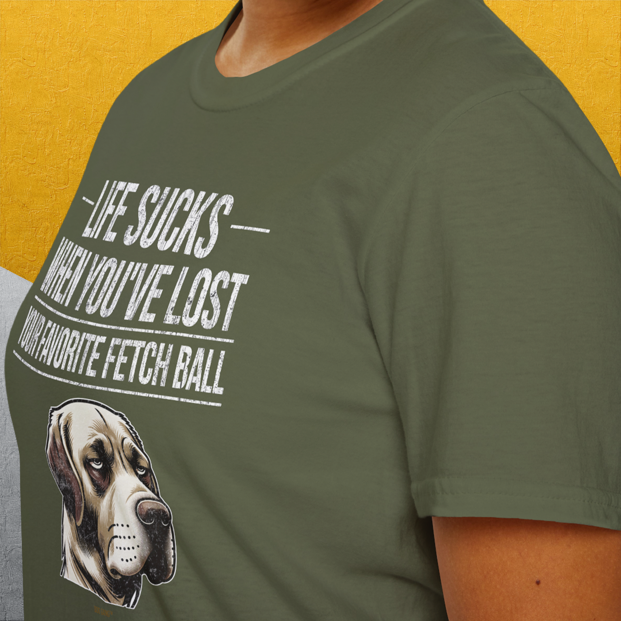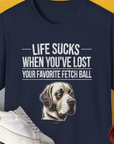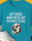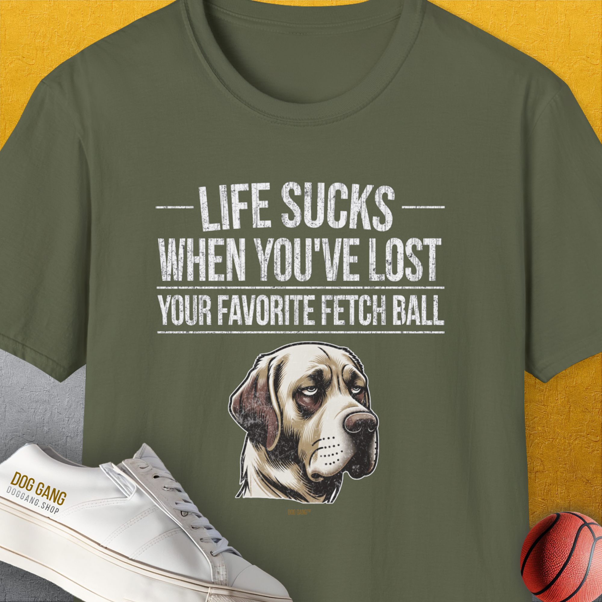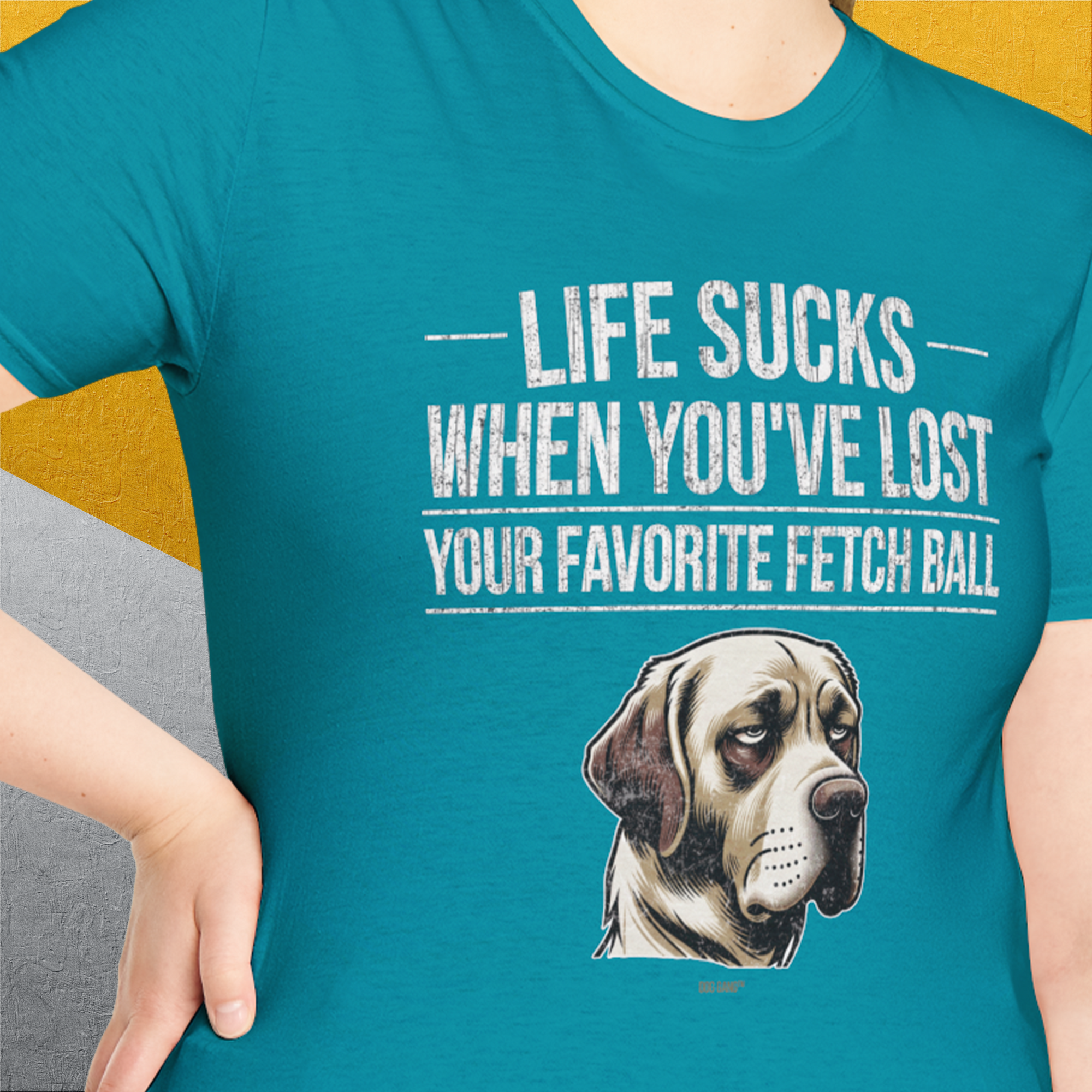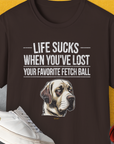 Soft-style cotton blend unisex t-shirt with a sad dog illustration and the quote: Life Sucks When Youve Lost Your Favorite Fetch Ball. Designed by Dog Gang.