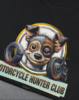 The black T-shirt features a funny graphic of a slightly battered dog with a black eye and the slogan "Motorcycle Hunter Club". Perfect for any dog ​​lover. Design by Dog Gang.