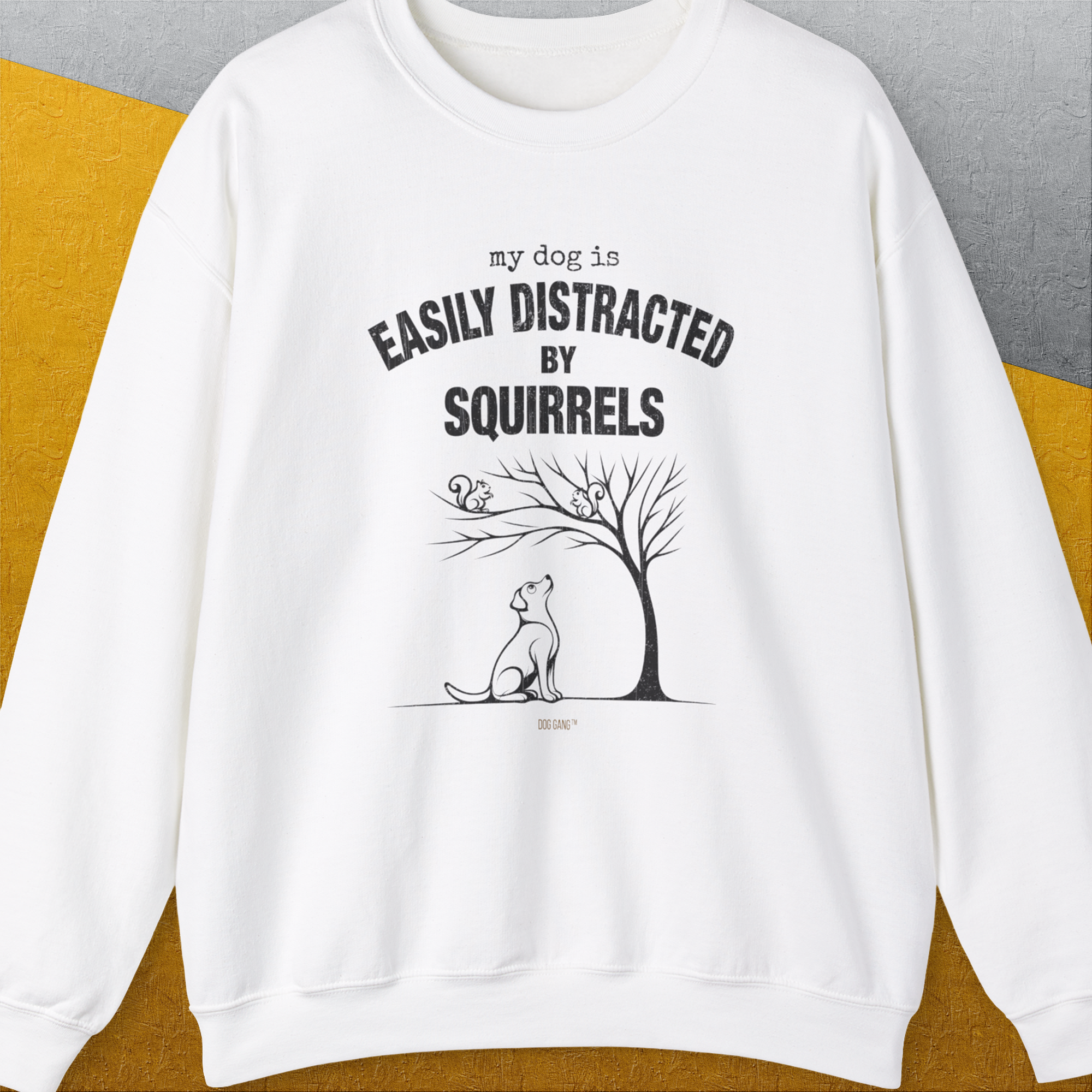 My Dog Is Easily Distracted By - Volume 1: Squirrels, Unisex Sweatshirt-White. A dog-themed Design from Dog Gang