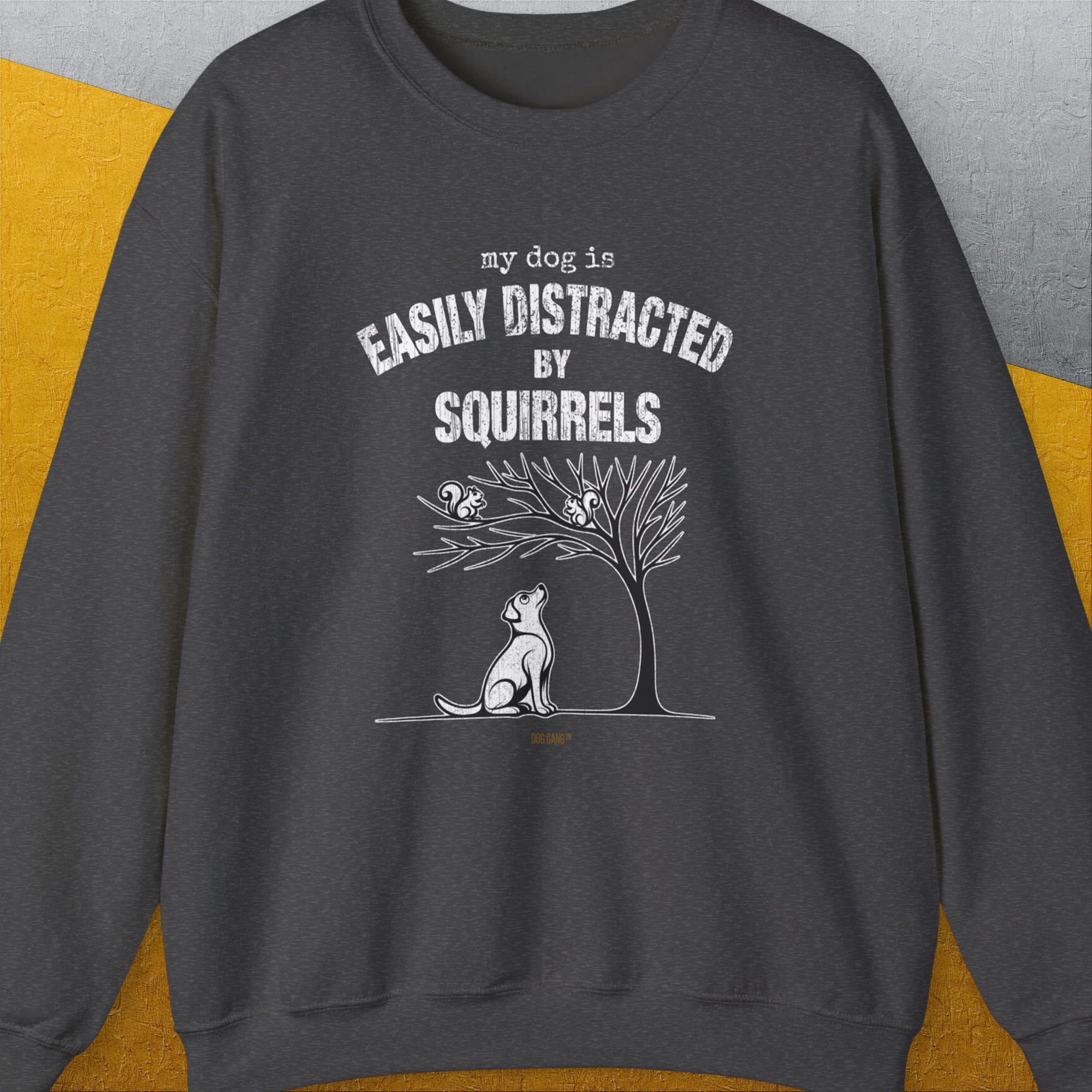 My Dog Is Easily Distracted By - Volume 1: Squirrels, Unisex Sweatshirt-Dark Heather. A perfect gift for dog lovers and dog owners. Design by Dog Gang