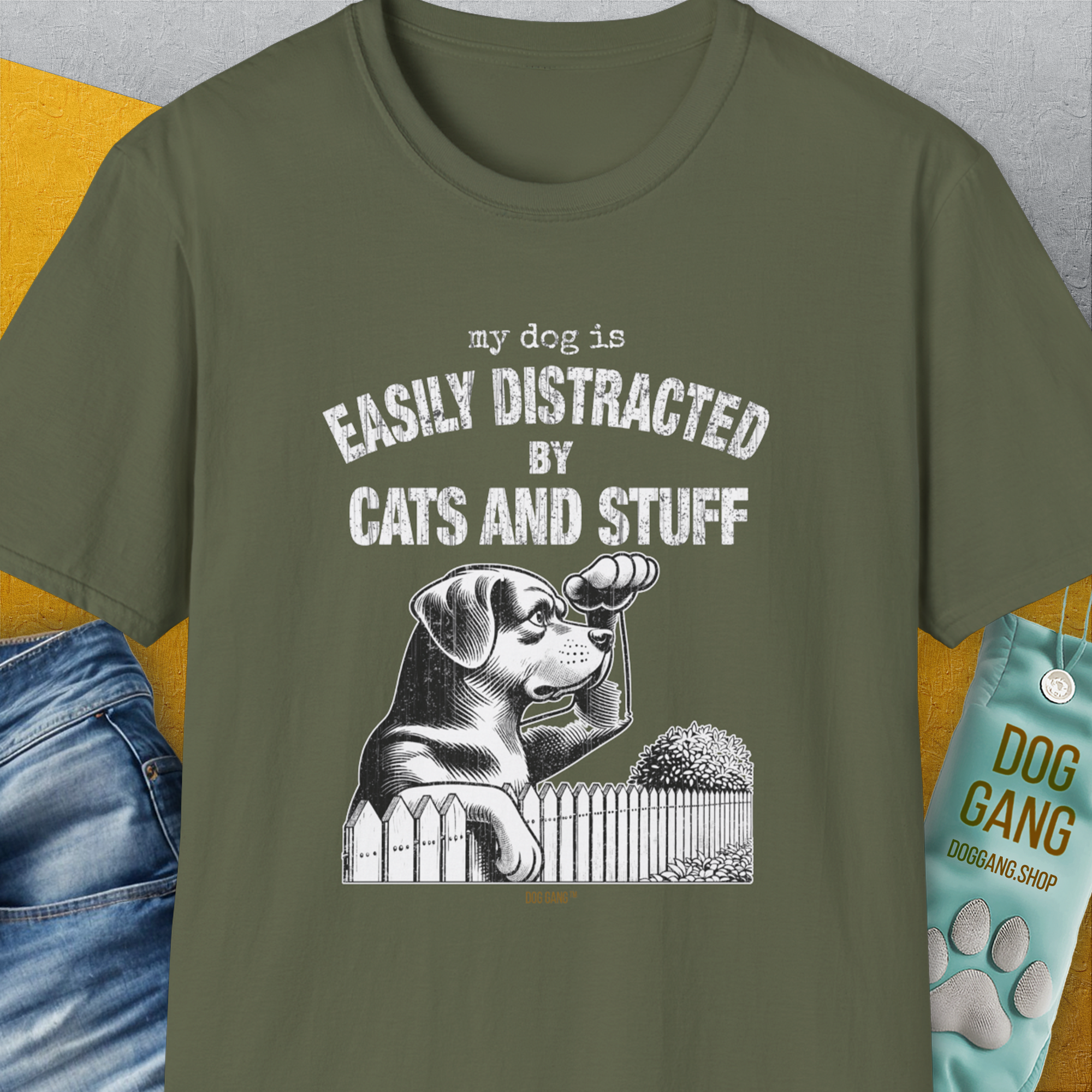 My Dog Is Easily Distracted By - Volume 2: Cats And Stuff, Unisex T-Shirt-Military Green, Design by Dog Gang