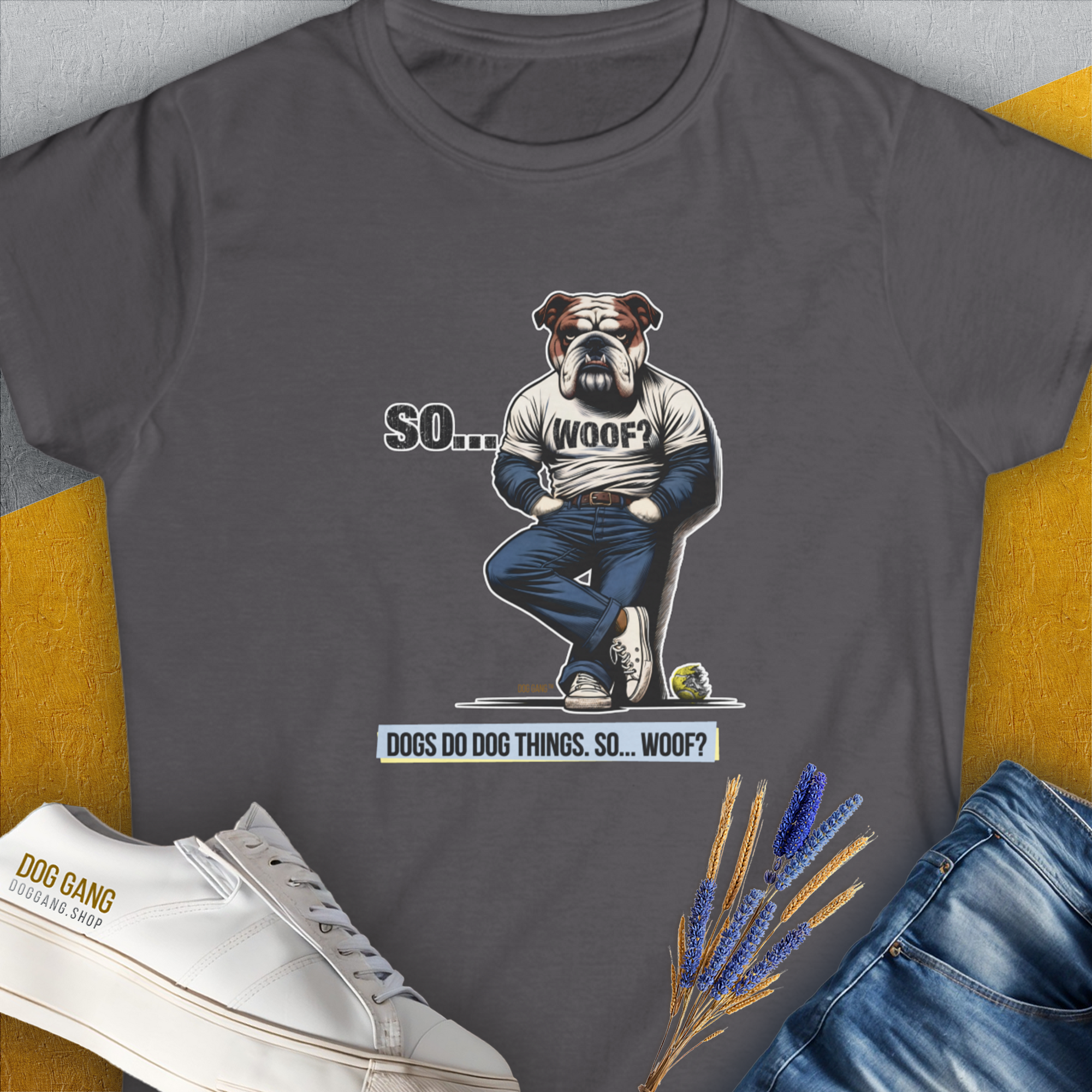 A cartoon dog leans against the wall, text saying, So... Woof? on this funny dog shirt. Designed by Dog Gang.
