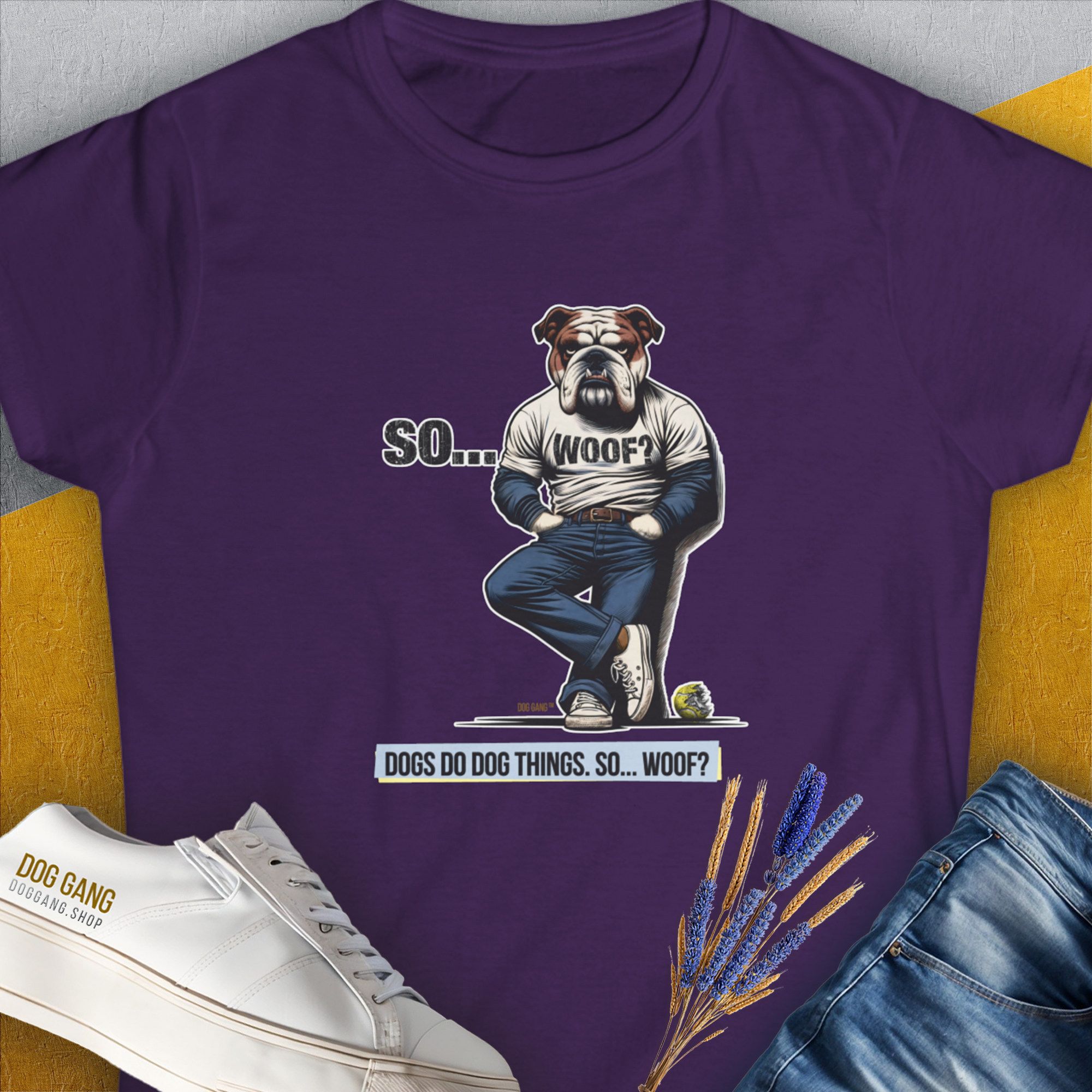 So... Woof? Volume 1, Women's T-Shirt-Purple. A perfect gift for dog lovers and dog owners. Design by Dog Gang