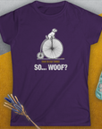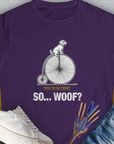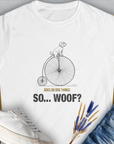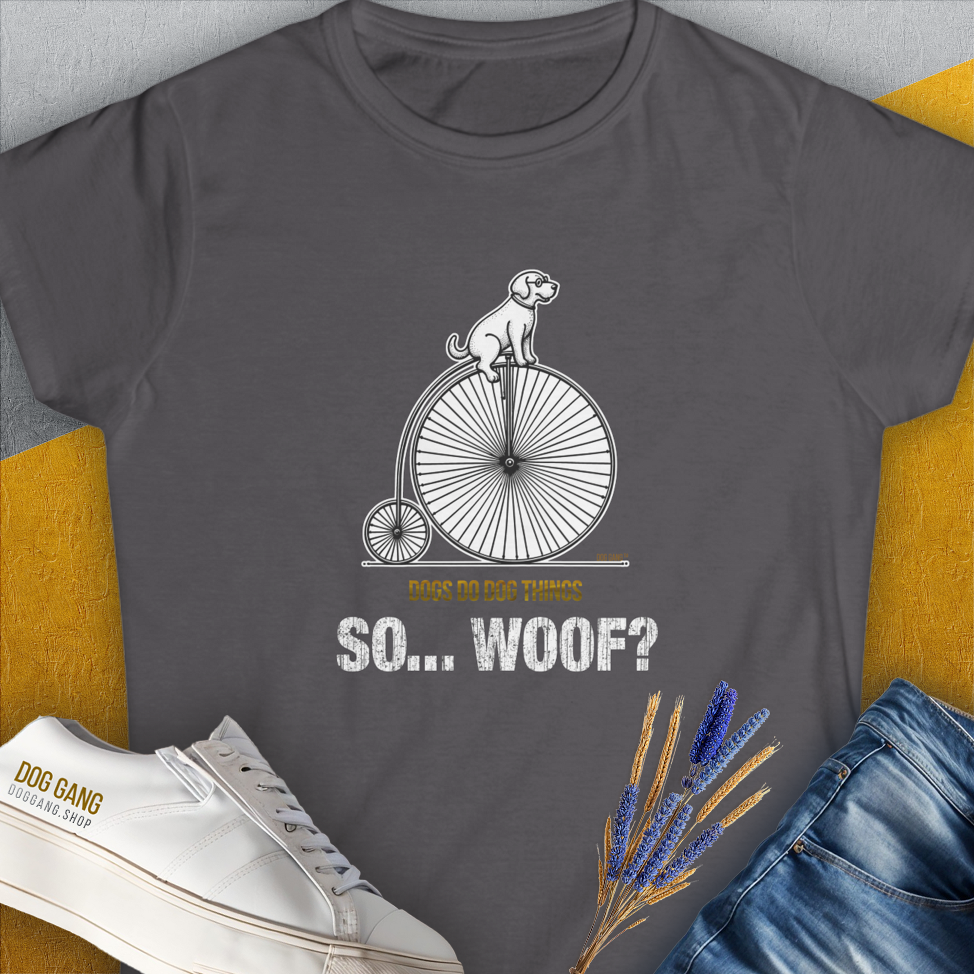 So... Woof? Volume 3 Womens T-Shirt features a playful dog on an old bicycle with Dogs do dog things. So... Woof? text. A perfect funny dog shirt for any dog lover. Designed by Dog Gang.
