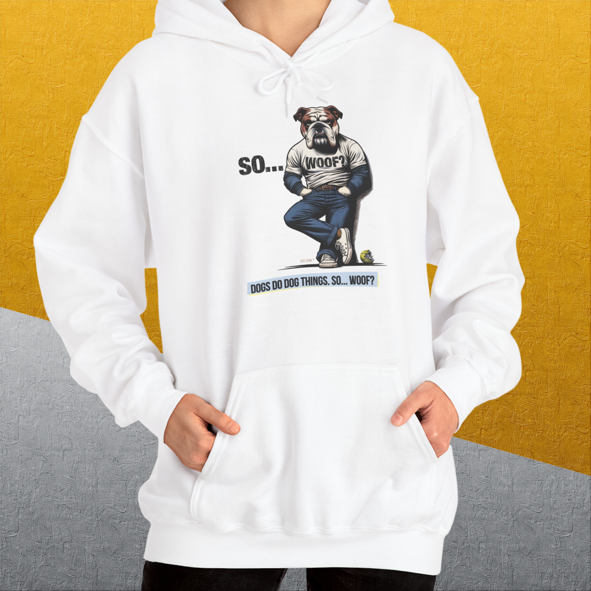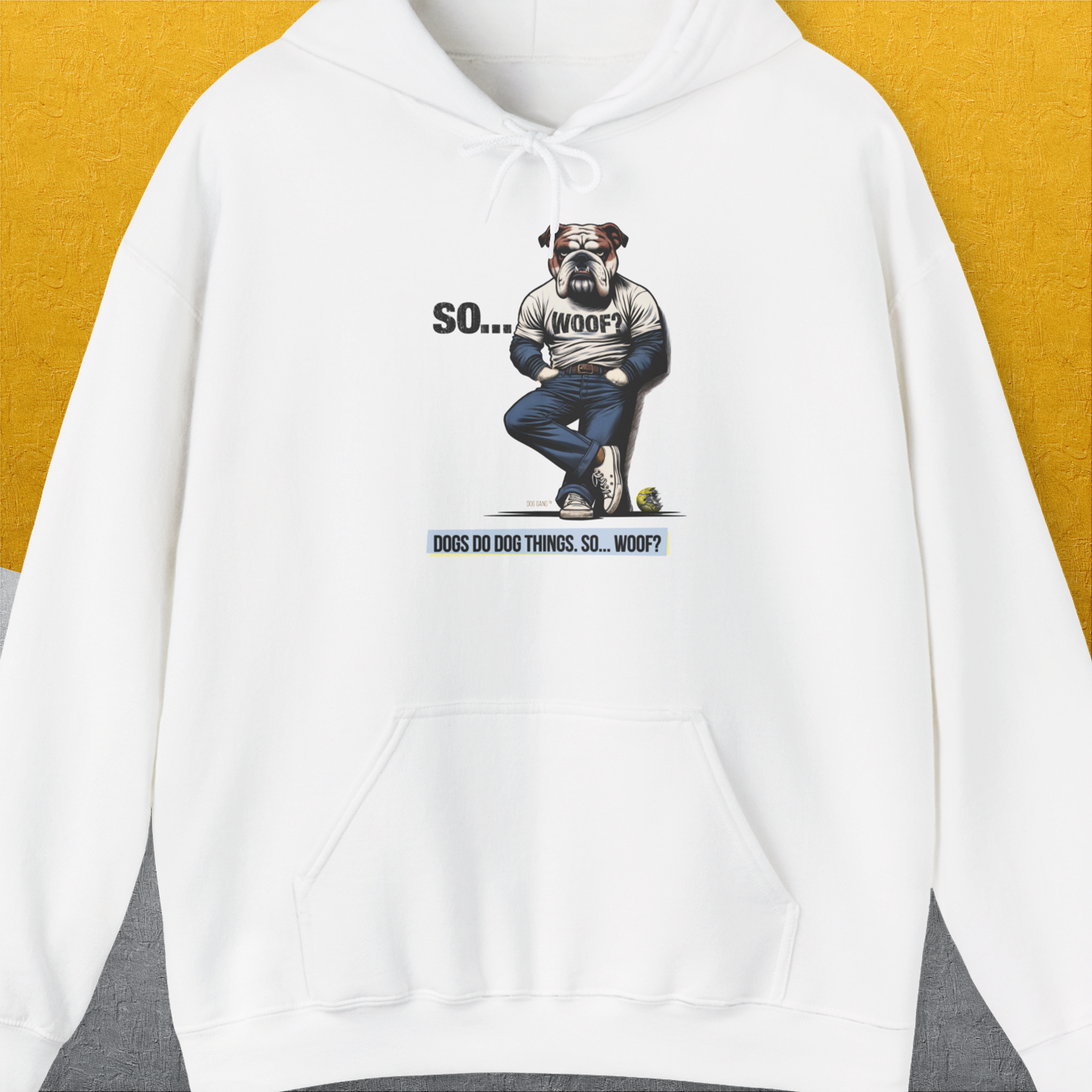 So... Woof? Volume 1, Unisex Hoodie-White, a cool and stylish design with a funny saying from Dog Gang