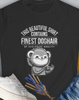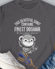 Cute cartoon dog with funny text: This Beautiful Shirt Contains Finest Dog Hair Of Exclusive Quality, Volume 2. Perfect for any dog owner. Designed by Dog Gang.
