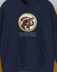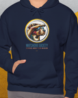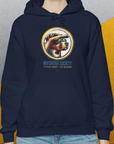 Navy unisex hoodie with a vintage design featuring a dog in aviator sunglasses looking into the distance, and the quote Serious About Our Mission. Funny dog shirt crafted from an ethically grown cotton-polyester blend. Designed by Dog Gang.